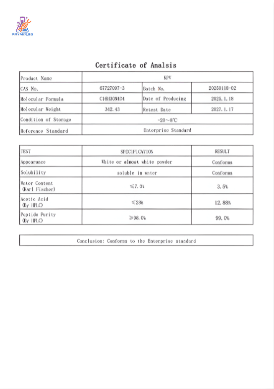 The stability of KPV in different formulations has been explored in research. Encapsulation in nanoparticles, incorporation into hydrogels, or conjugation to other molecules can affect stability characteristics. These specialized formulations may have different storage requirements than simple reconstituted solutions, and their stability should be characterized specifically for each formulation.